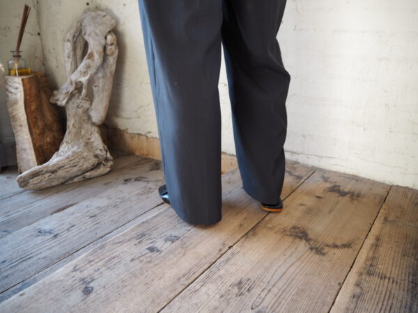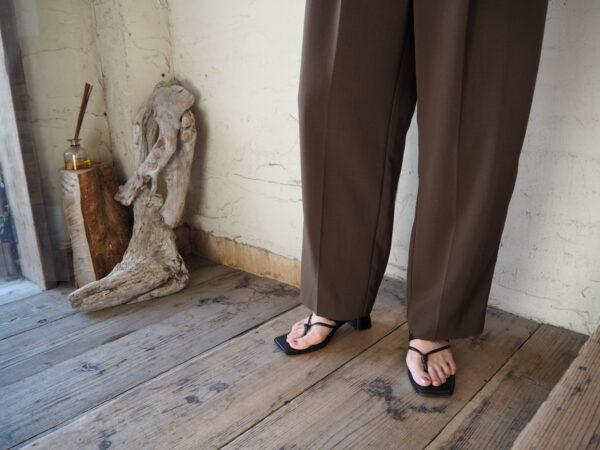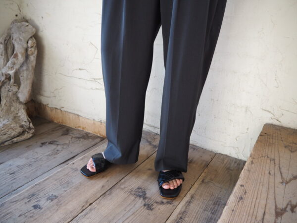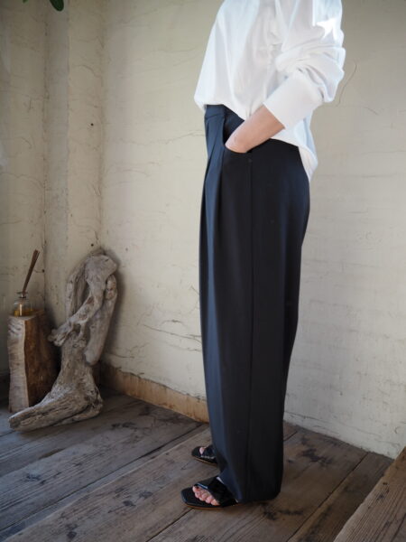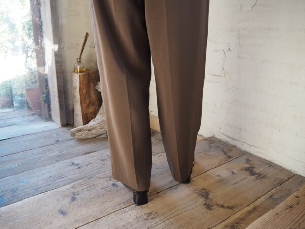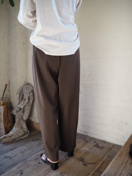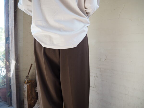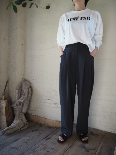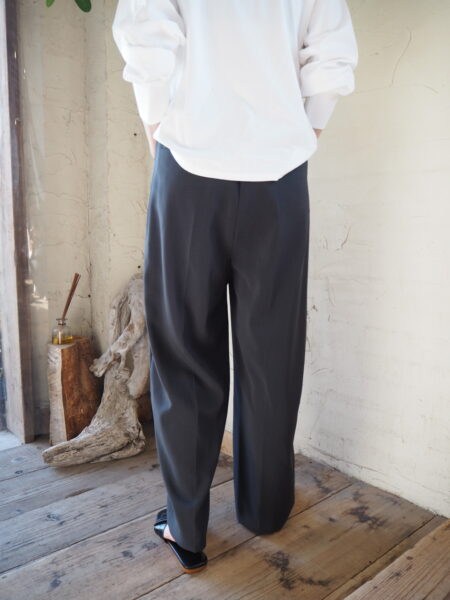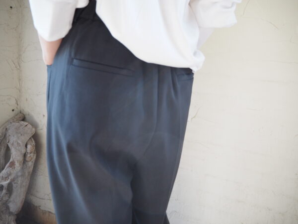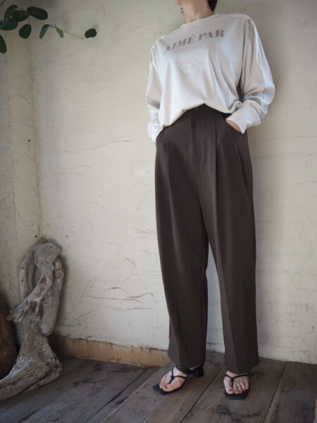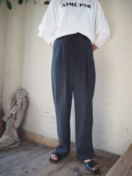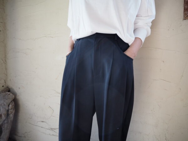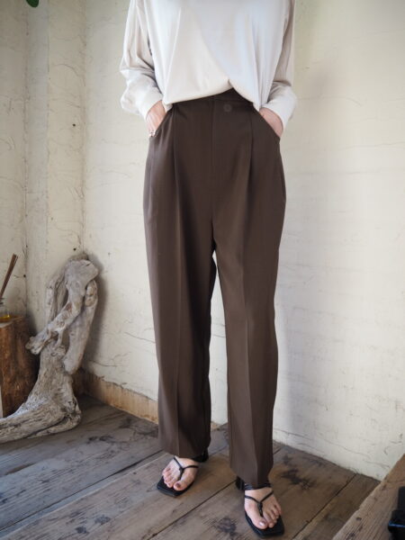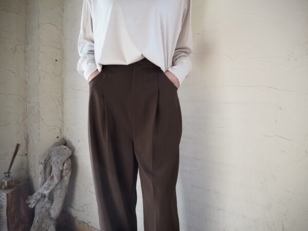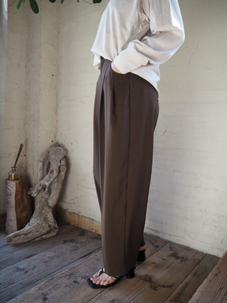 フロントにタックが入り、裾に向かって緩やかなテーパードシルエットのパンツ