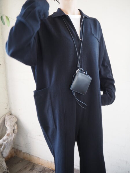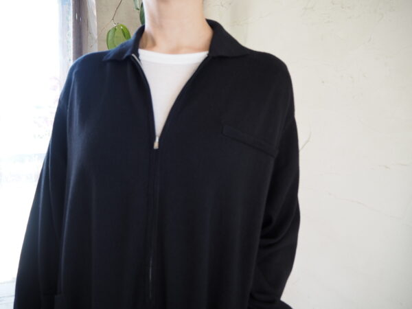 布帛のジャンプスーツを思わせるような端正なディティールをハイゲージニットで柔らかく表現したオールインワン