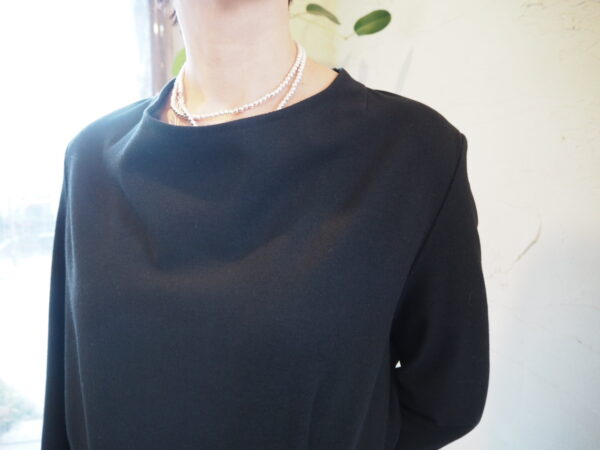 襟元に自然な落ち感を持たせたドレープが、顔周りに柔らかな印象を与え、シンプルな中にもさりげない個性を演出