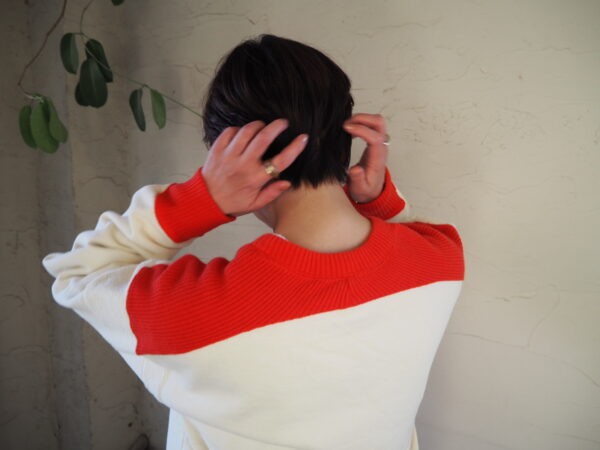 ネック部からショルダーの切り替え、袖口、裾にはローゲージニットのようなカットソー素材を使用しています