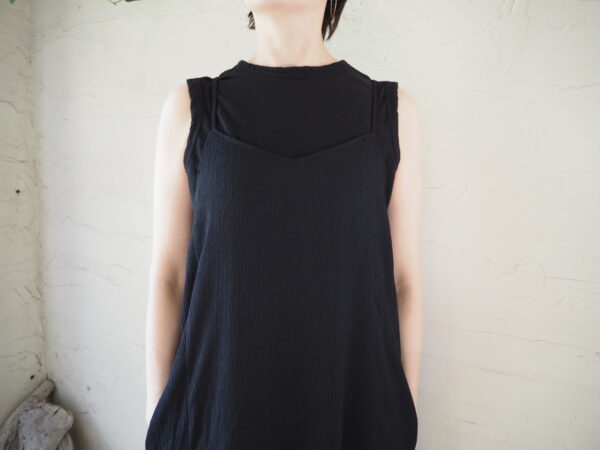 共地の細紐は華奢なので、キレイ目系からカジュアルTシャツまで重ねても