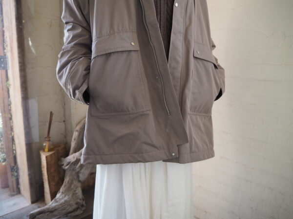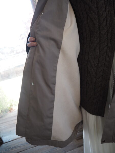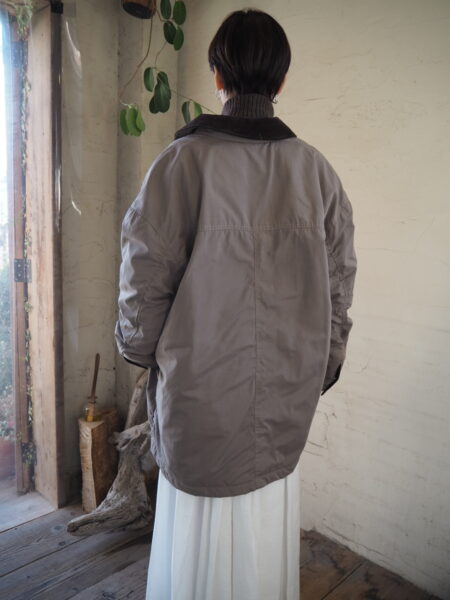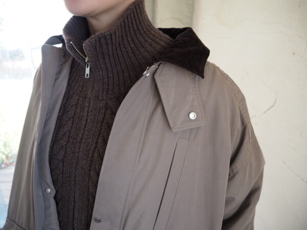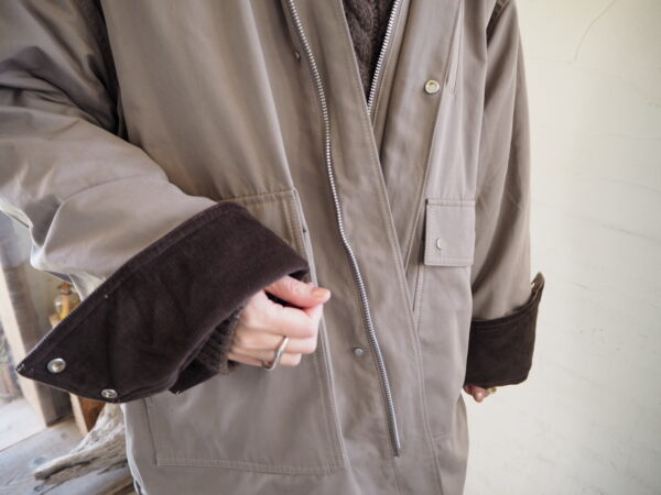 襟と袖口裏にはコーデュロイ素材を切り替えで配し、ワントーンの中にさりげないコントラストをプラス。