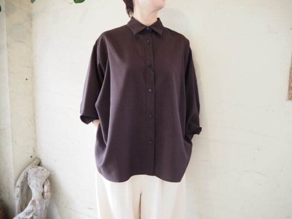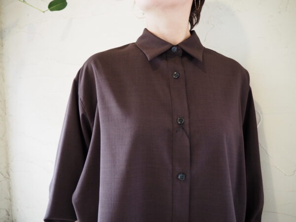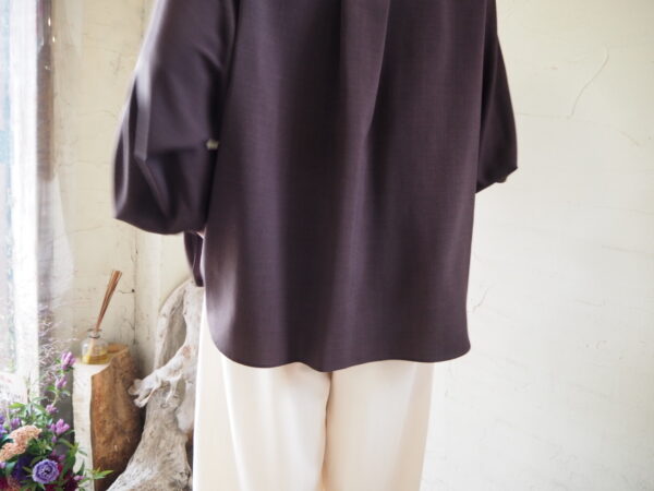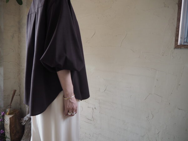 カフス釦を外すと立体的なラウンドシルエットが現れる一癖ありのデザインブラウス。