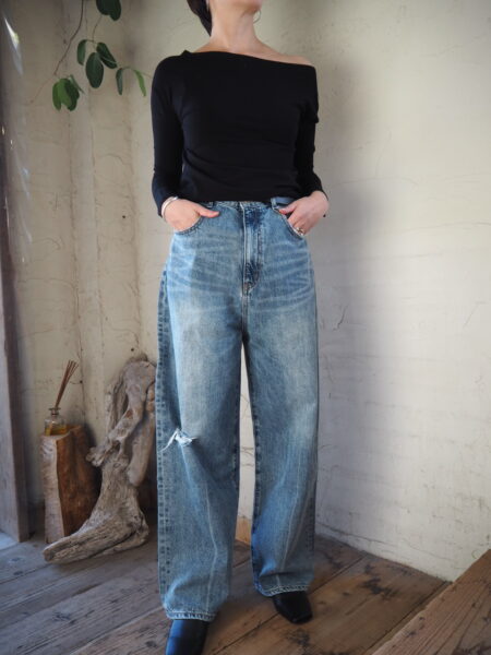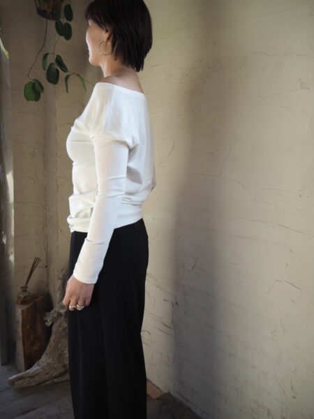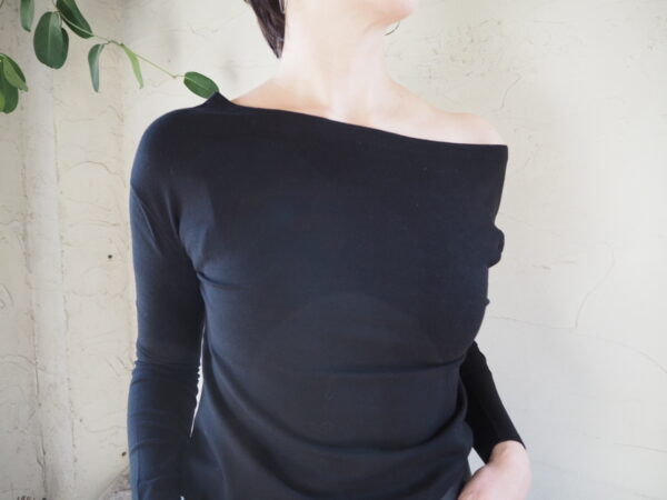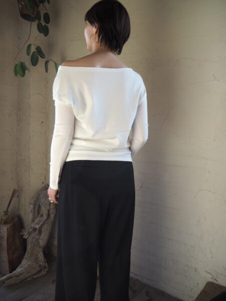 肩を出したアシンメトリーなオフショルダーの着こなしもおすすめです。
