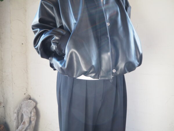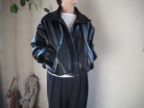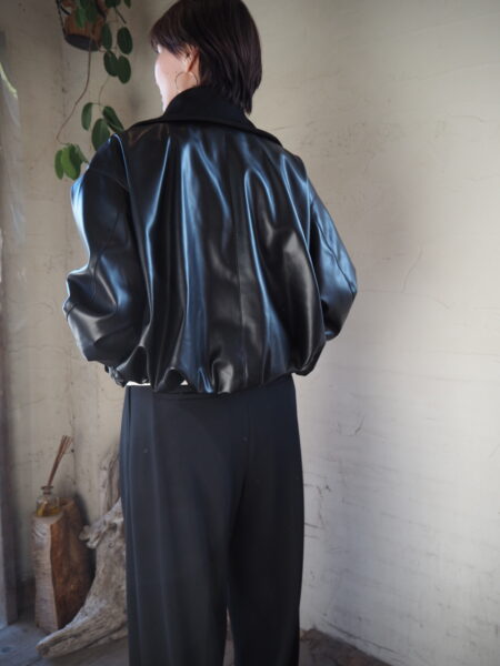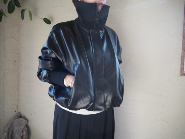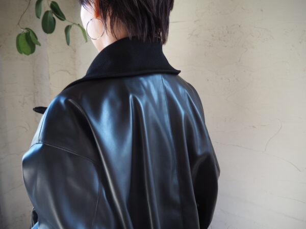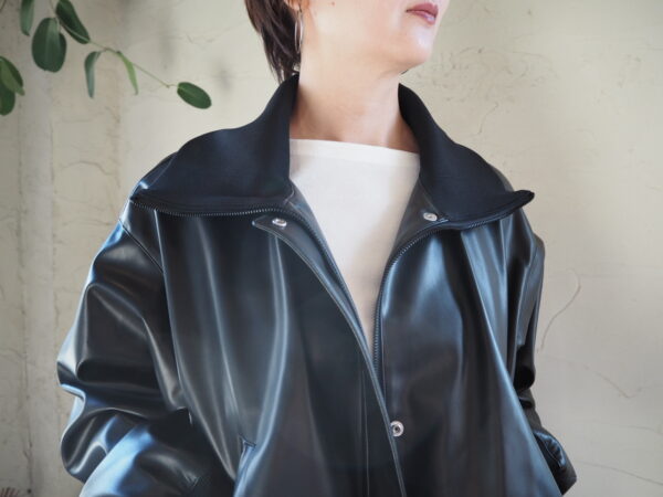 まるで本物のような質感と光沢感を持つフェイクレザーとリブをドッキングさせたジャケット。