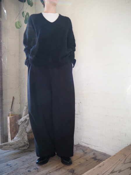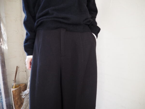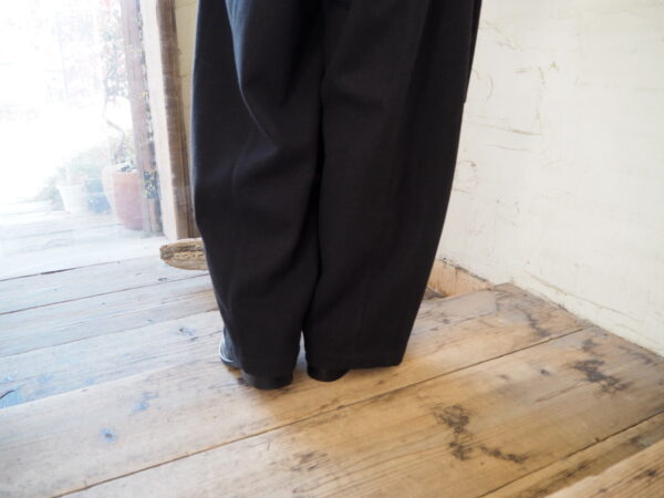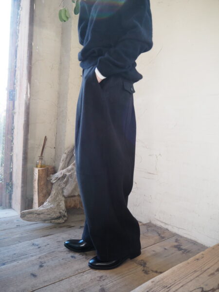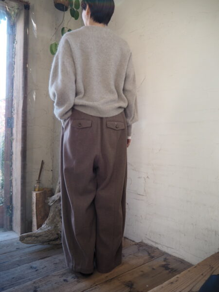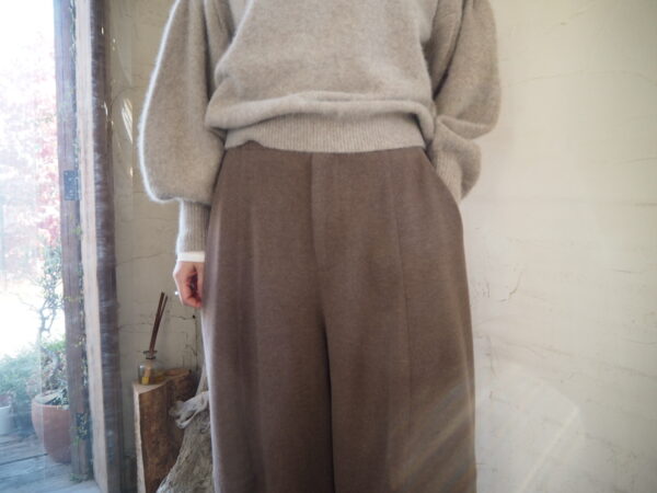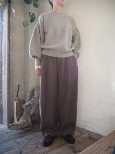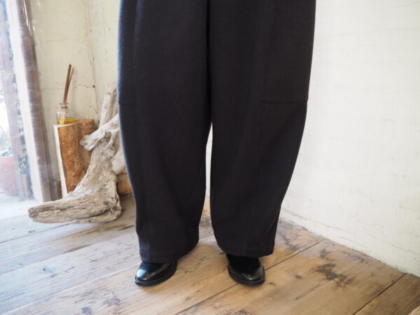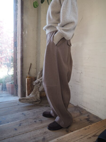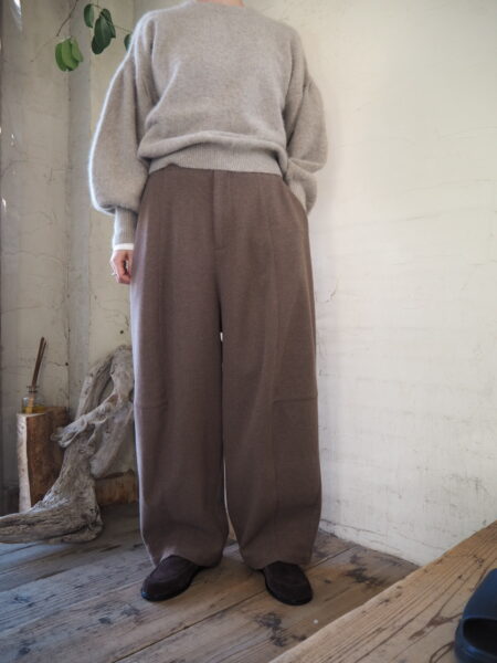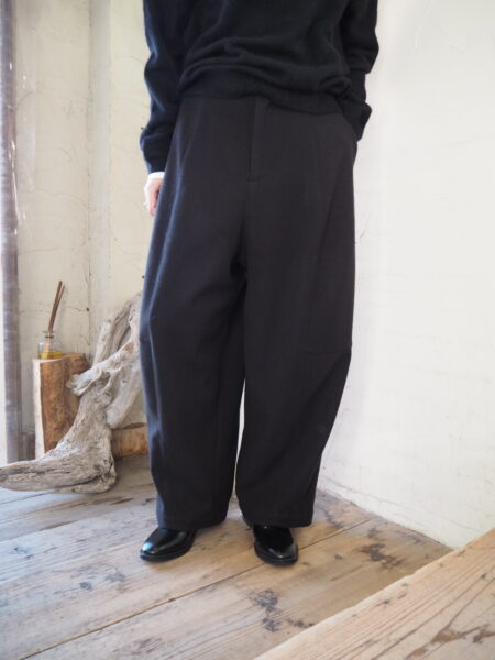 軽さと暖かさのバランスが絶妙な素材を使用したバレルレッグパンツ。