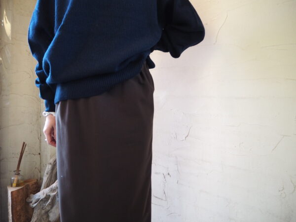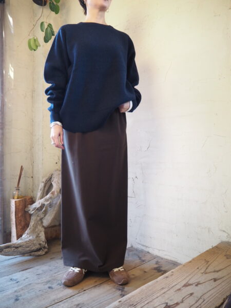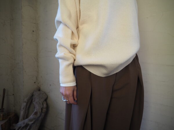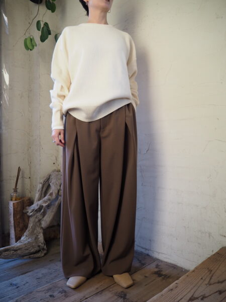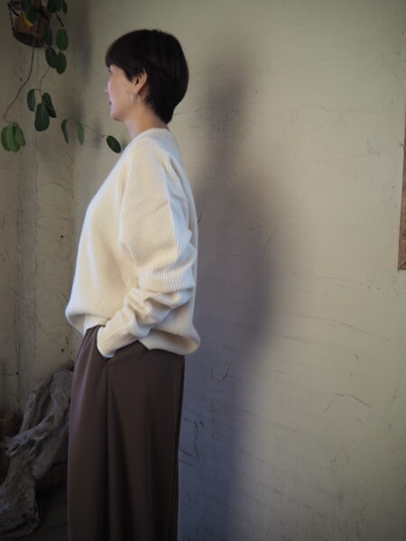 メリノウール×ヤクの膨らみのある糸が、構築的なラインに優しさを与え、ミニマルながらもモードな印象に仕上げています
