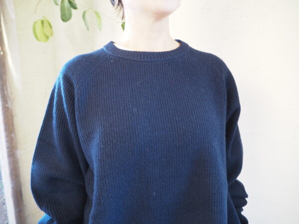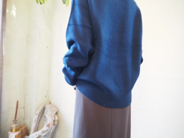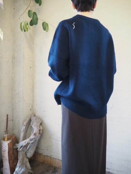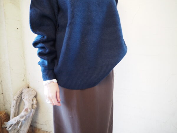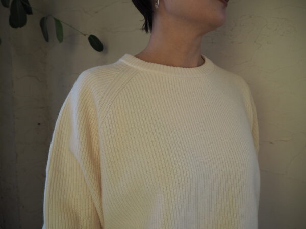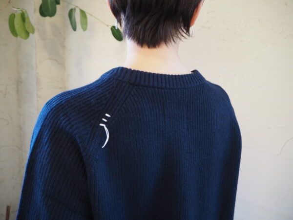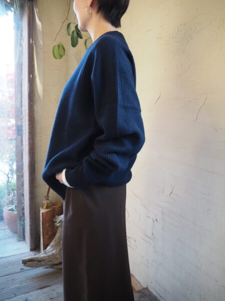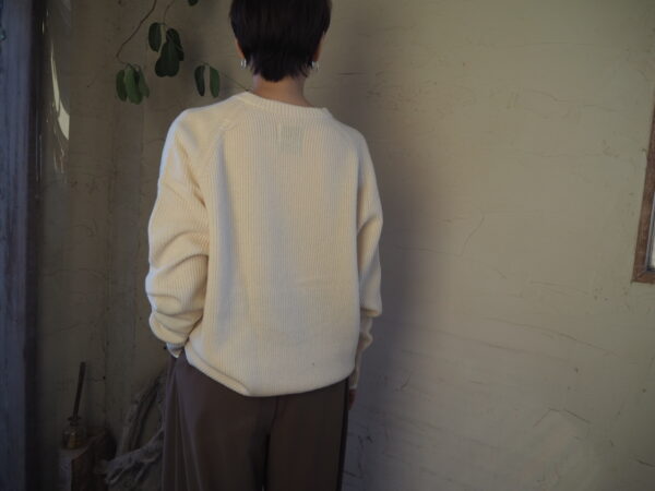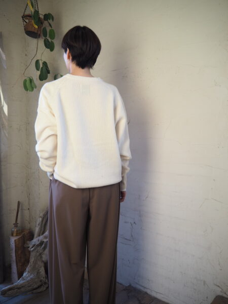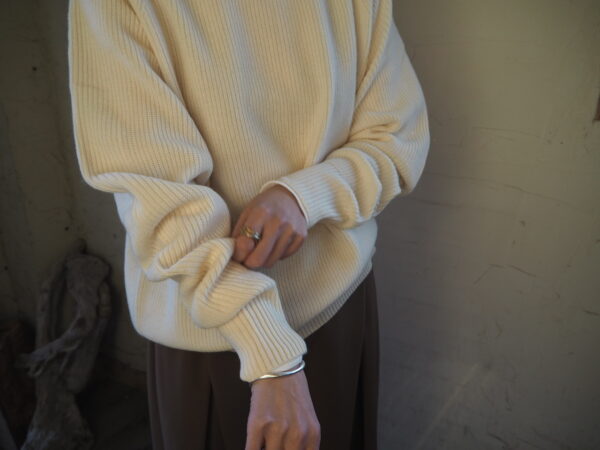 袖にカーブを描く独自のパターン設計を施し、肘周りに自然と分量がたまる立体的なフォルムが特徴のニット