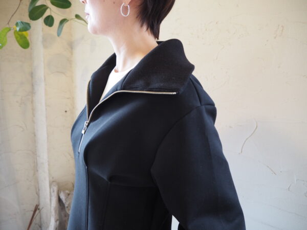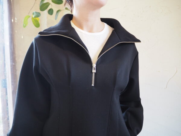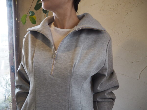 ハーフジップとリブ襟のコンビが、スポーティなムードを添えつつ、