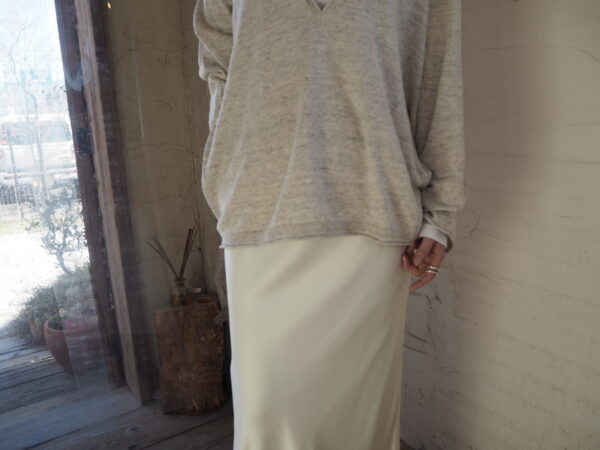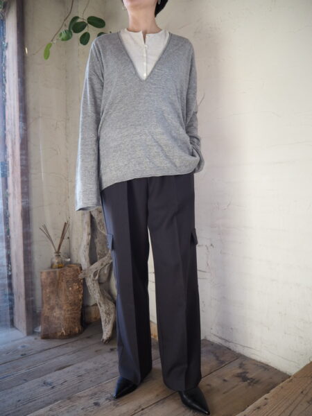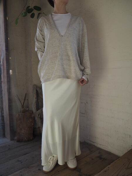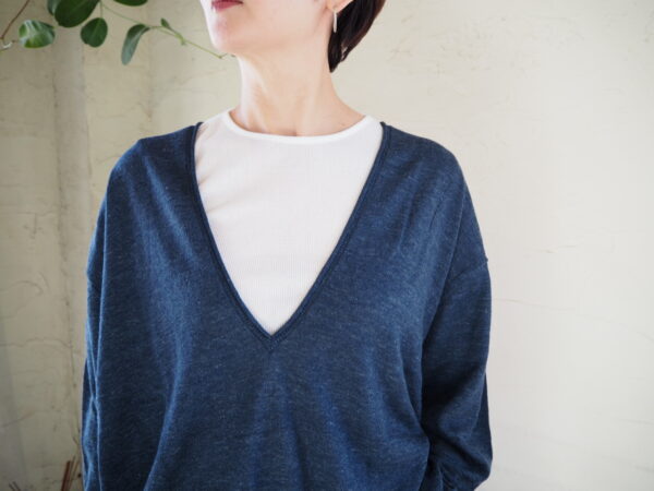 印象的なVネックはデコルテラインを美しく見せながらもインナー次第で表情を変えられるデザインです