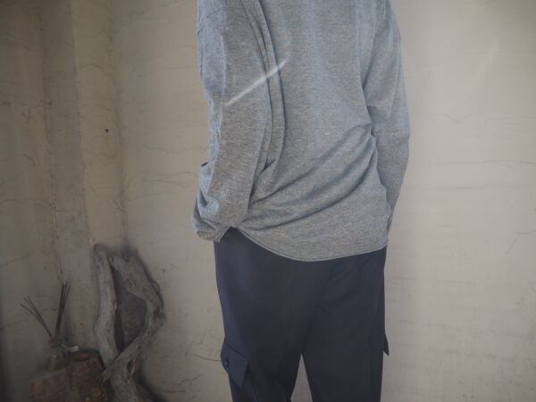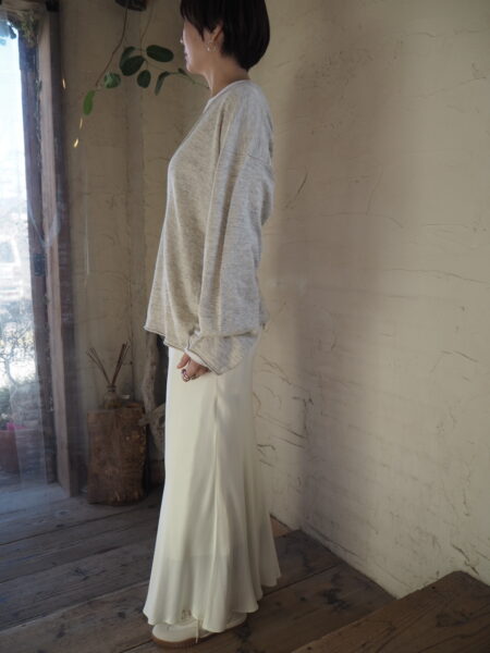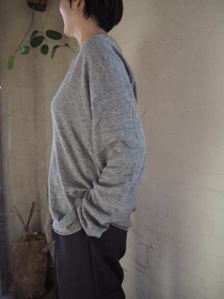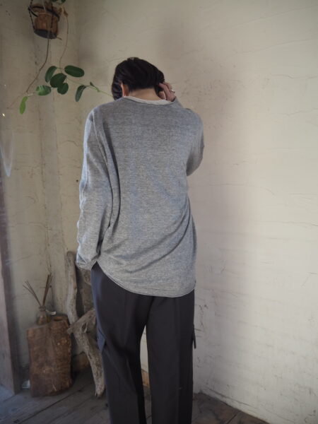 細番手のメランジ糸を14ゲージで丁寧に編み立てることで、繊細さと上品な透け感を兼ね備えた一枚に仕上げています