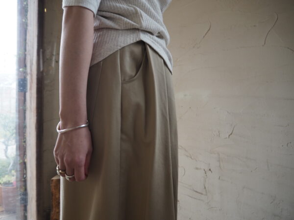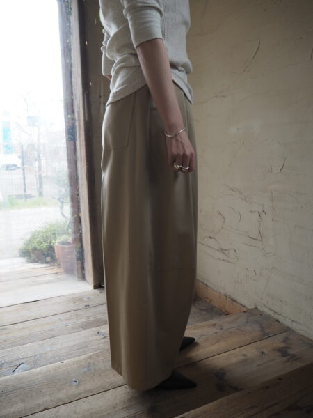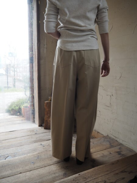 フロントには深めのタックを配し、腰回りに程よく余白を持たせながらも、サイドに沿う立体的なカーブラインが美しいシルエットを作ります