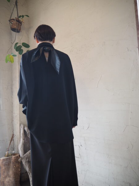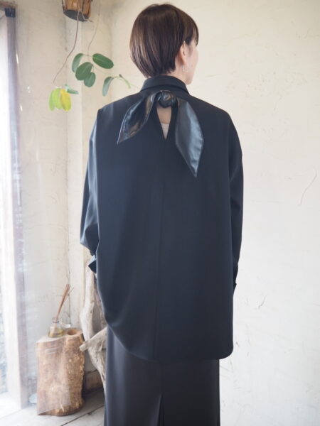バックスタイルのキーネックにあしらったレザー調のボウタイが、後ろ姿を印象的に演出するデザインブラウス