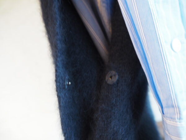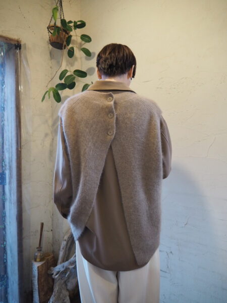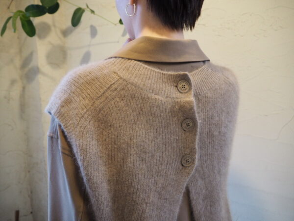 Vネックフロントに、バックネックは同色ボタン仕様。