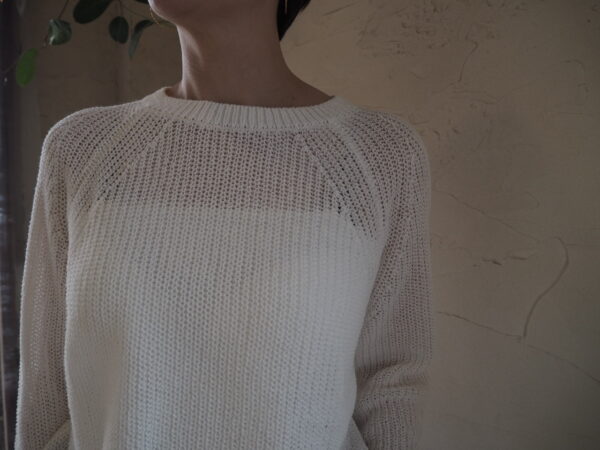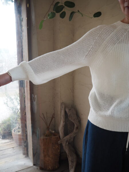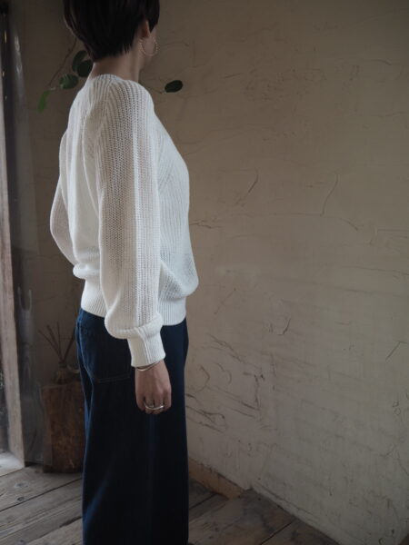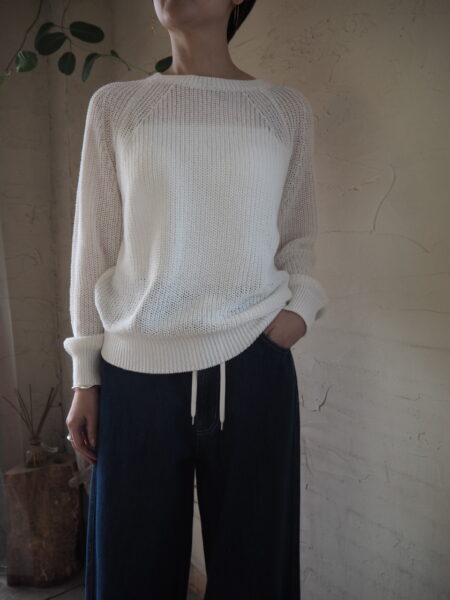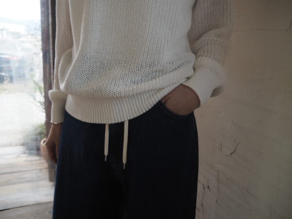 コットン糸の表面に樹脂コーティングを施した素材を使ったニットプルオーバー。